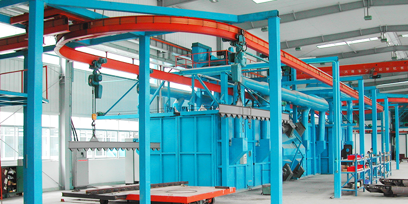 The operator presses the work button, the door of the shot blasting chamber is closed pneumatically, the track works forward, and the workpiece is continuously rolled. The high-strength and high-speed projectiles from the shot blasting machine can completely and evenly clean the surface of the rolling workpiece. The projectiles enter the screw conveyor through the submerged hole of the crawler conveyor, then are transported to the steel bucket elevator. The bucket elevator transports them to the separator, which separates and stores them for use. After shot blasting, the shot blasting door opens automatically, and the track reverses to unload the workpiece.